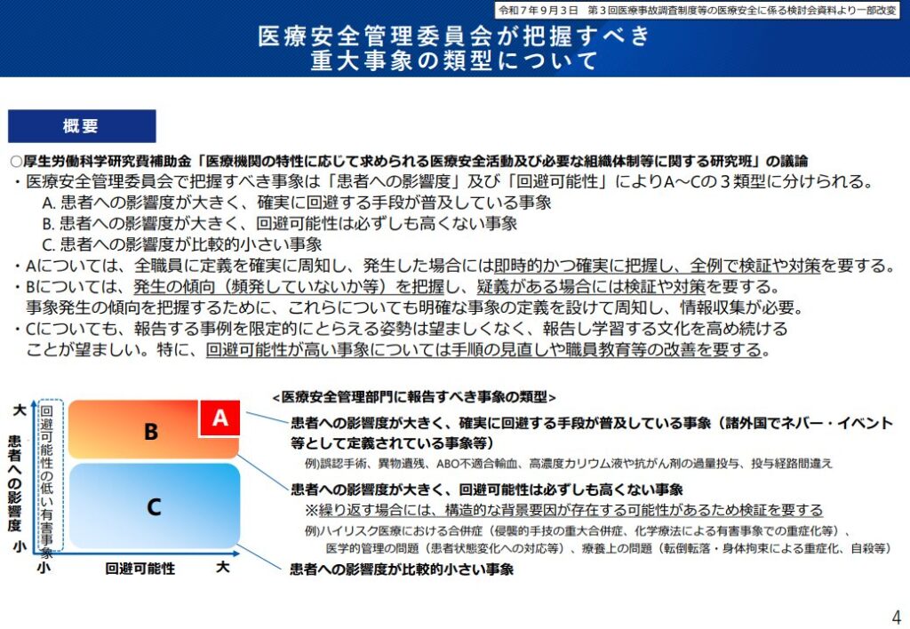 例えば、レポートとして管理し医療安全管理者が委員会へ報告する事象が、具体的に定められる可能性があります。