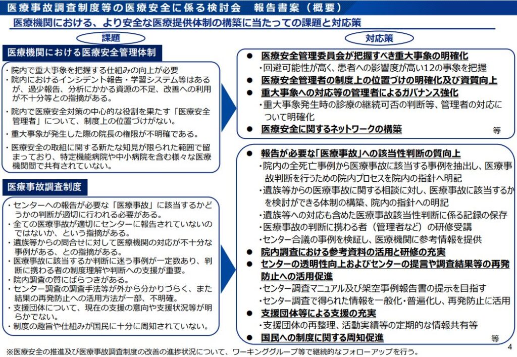 検討会では、開催の目的を「これらを含む医療安全施策とその課題を整理し、対応策を検討すること」としています。
